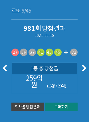 | 로또 982 회 당첨번호 모음 및 최근 안 나온 수, 최근 많이 나온 수 (0) | 2021.09.25 |