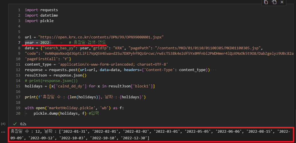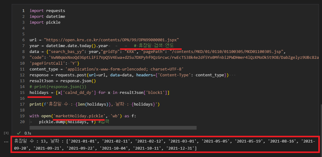 marketHoliday.pickle 파일에 holidays 라는 변수명으로 저장하도록 구성을 했습니다.