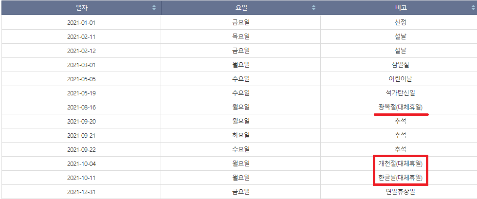 이번 년도 대체 휴일은 광복절, 개천절, 한글날 이렇게 3일 이었습니다.