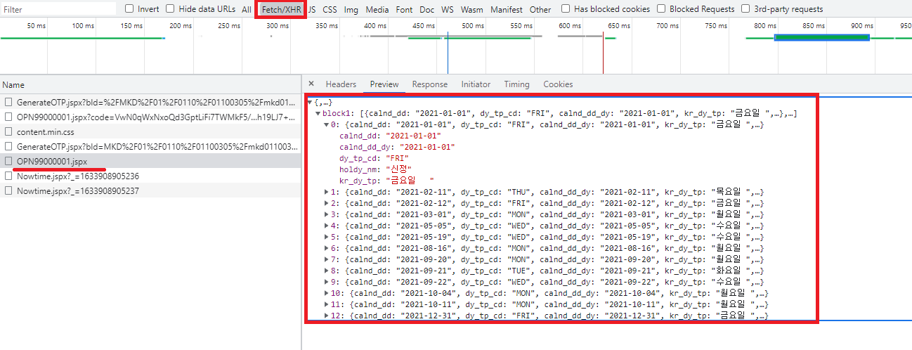 결론적으로 위에서 소개한 한국거래소 휴장일 페이지는 비동기 방식으로 휴장일 데이터를 가져오게 되는 것이었고~