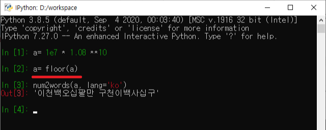 이렇게 설정을 해 놓고 IPython 을 실행해 보면 아래 그림과 같이 IPython 사용시 math 모듈에 있는 floor 함수등도 쉽게 사용 할 수 있습니다.