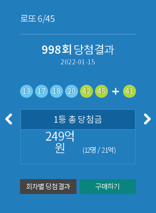 | 로또 999 회 당첨번호 모음 및 최근 안 나온 수, 최근 많이 나온 수 (0) | 2022.01.22 |