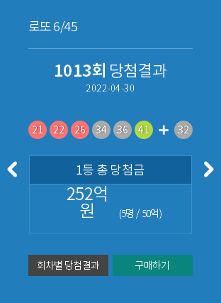 최근 1 회 동안 안 나온 번호: 1 2 3 4 5 6 7 8 9 10 11 12 13 14 15 16 17 18 19 20 23 24 25 27 28 29 30 31 33 35 37 38 39 40 42 43 44 45