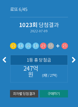 1023 회 로또 당첨 결과 입니다. 이번 1023 회는 9 명이 1등에 당첨됐네요.
