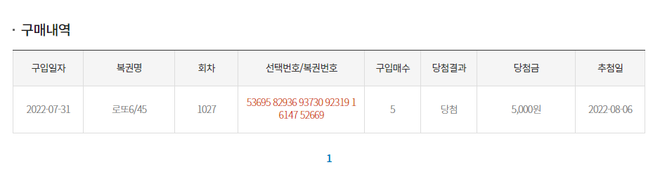 정말 간만에 5등 당첨~