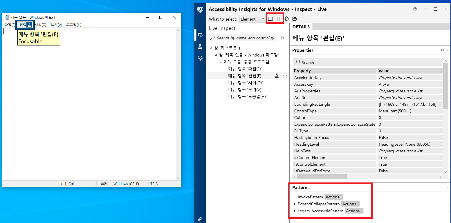 아래 화면은 Accessibility Insights for Windows 를 실행하고 메모장의 편집 메뉴에 대해서 확인해 본 것인데~ 아래와 같이 각 요소의 pattern 을 확인 할 수 있습니다.