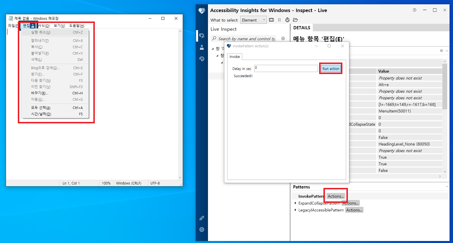위 그림과 같이 편집 메뉴에 마우스를 올려서 포커싱을 하고 Accessibility Insights for Windows -> patterns -> Actions… 버튼을 눌러서 “InvokePattern Action(s)” 창을 열어 줍니다.