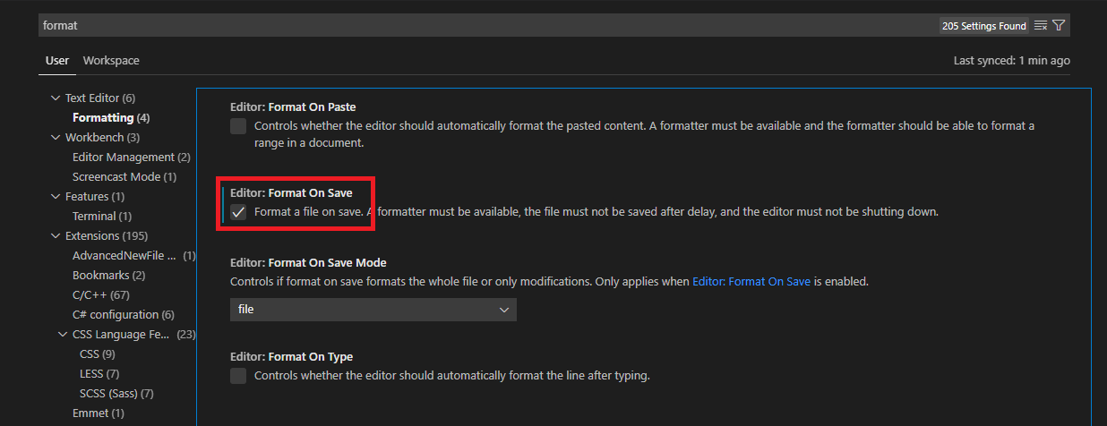 그런데 저는 아래와 같이 코드 저장시 자동으로 Formatting 을 하도록 설정해서 사용하고 있는데, AutoHotkey Plus Plus 를 사용하는 경우 Formatting 이 약간 이상하게 되는 것을 확인할 수 있었고 이런 이유로 AutoHotkey Plus 플러그인을 설치해서 사용하고 있습니다.