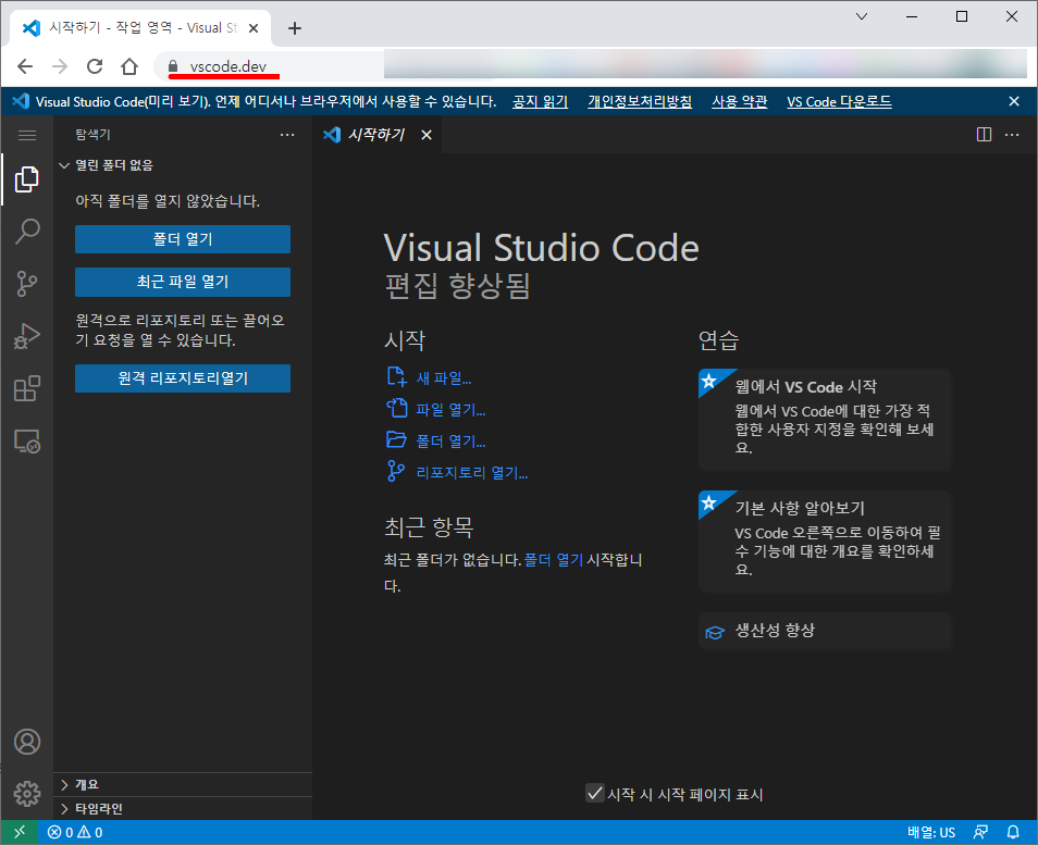 설치가 귀찮으신 분들은 아래 웹 페이지에 들어가서 Visual Studio Code 를 사용할 수도 있습니다
