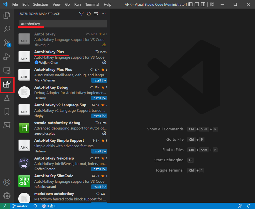 Visual Studio Code 에서 Autohotkey 코딩을 할때는 당연히 Autohotkey 가 설치가 되어 있어야 하겠고, Autohotkey 코딩을 도와줄 Autohotkey Extension 을 설치해서 사용하시면 되겠습니다.
