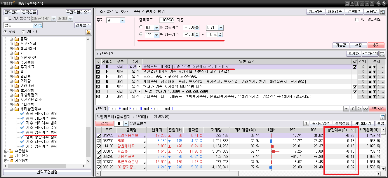 그런데 이렇게 포트폴리오를 구성하는 경우 포트폴리오를 구성하는 종목 간의 상관도가 낮은 것이 좋다고 하더군요. 그렇다면 포트폴리오를 구성하기 위해 낮은 상관도의 종목들을 검색을 해야 되는데, 첫 번째로 생각했던 방법은 모든 종목의 주가를 다운로드 받아서 종목간의 상관도를 구하는 것이었습니다. 시간을 들여서 할 수는 있겠지만, 일단은 귀차니즘이 발동해서 HTS 종목 검색 메뉴를 찾아봤습니다.