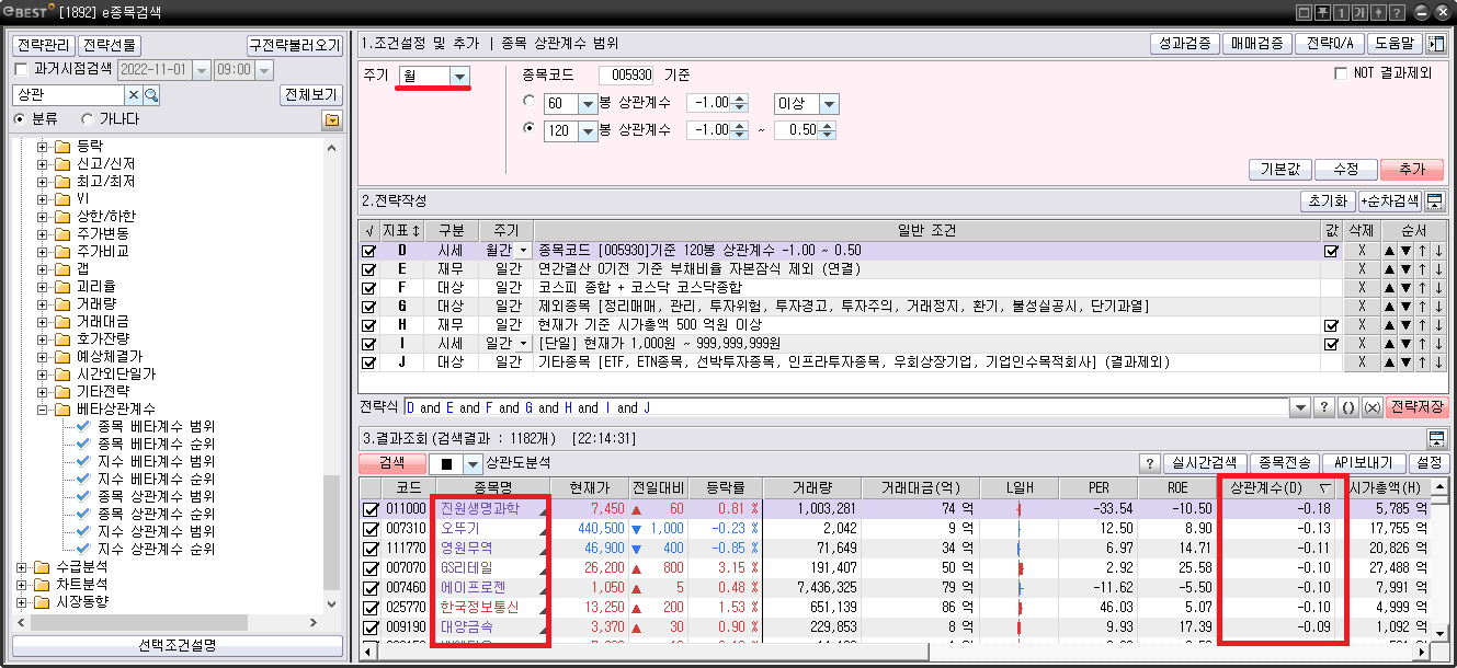 제가 사용하는 이베스트투자증권 HTS 에서 “[1892] e종목검색” 을 찾아보니 아래와 같이 “시세분석>베타상관계수” 에서 “종목 상관계수” 를 검색할 수 있었습니다.