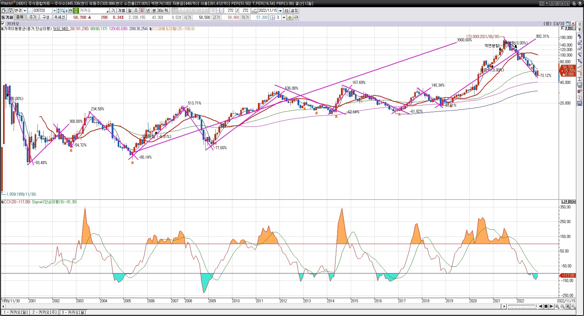 그래서 현재 국민 역적 주로 찍힌 “카카오 주식에 투자를 했었으면 얼마나 벌 수 있었을까?” 라는 궁금증이 생겼습니다. 월봉상 모멘텀 지표 중에 하나인 CCI(Commodity Channel Index) 를 보면서 과매도 근처에 사서 과매수 일때 매도한다면 어느 정도나 벌었을까를 대략적으로라도 알고 싶었습니다.