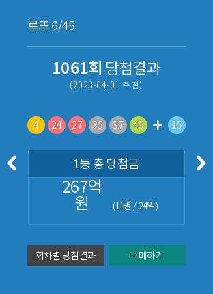 | 로또 1063 회 당첨번호 모음 및 최근 안 나온 수, 최근 많이 나온 수 (0) | 2023.04.15 |