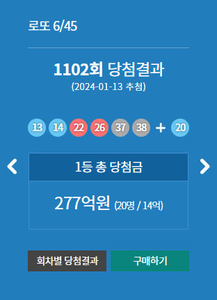 | 로또 1102 회 당첨번호 모음 및 최근 안 나온 수, 최근 많이 나온 수 (430) | 2024.01.13 |
