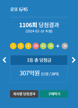 1106 회 로또 당첨 결과 입니다. 이번 1106 회는 11 명이 1등에 당첨됐네요.