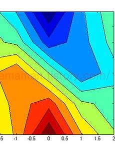 MATLAB contour() 함수를 이용하면 등고선 그래프를 매우 쉽게 그릴 수 있다. 다음과 수식에 따른 값에 대해 등고선을 그려 보자. [X,Y] = meshgrid(-2:2); % X,Y 값 설정 Z = 10*(X/5 - X.^3 - Y.^5).*exp(-X.^2-Y.^2); % Z 값 계산 위 식에 대해 아래 명령으로 등고선을 간단하게 그릴 수 있다. figure, contour(X,Y,Z), colorbar 등고선 사이의 표면에 색을 입히고 싶다면 contourf() 함수를 이용한다. figure, contourf(X,Y,Z), colorbar 다음과 같은 등고선 그래프를 얻을 수 있다. 위 그래프를 보면 간격이 너무 넓어서 등고선이 너무 각진 형태로 나오는 것을 확인 할 수 있다. 이럴 때는..